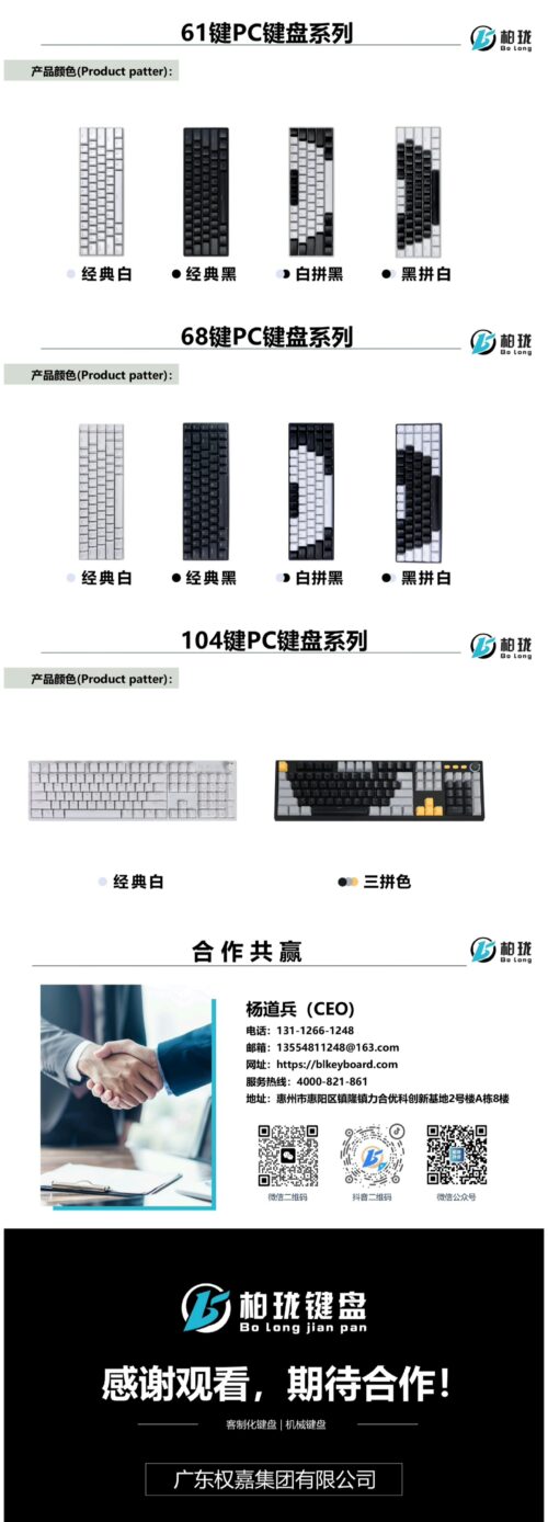 镂空机械键盘源头工厂【广东权嘉集团有限公司-CEO-杨道兵】工厂货源 创始人 总经理 CEO姓名:杨道兵 手机:13112661248 公司:广东权嘉集团有限公司 职务:CEO&总经理 微信:13112661248 邮箱:bolongjp@163.com 地址:惠州市惠阳区镇隆镇⼒合优科创新基地2号楼A栋 网址:https://blkeyboard.com电子版名片微信二维码简介:柏珑键盘,键证热爱 柏珑键盘-202551128 扫码在手机上查看