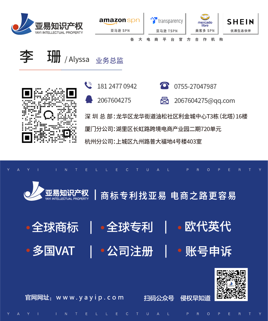 带领团队为全球客户提供商标专利注册、版权保护、侵权投诉及税务筹划等专业解决方案【亚易知识产权-市场总监-李珊】知识产权/商标专利/VAT企业服务培训/咨询/法律 负责人 总监姓名:李珊 手机:18124770942 公司:亚易知识产权 职务:业务总监 QQ:2067604275 邮箱:2067604275@qq.com 地址: 深圳市龙华区龙华街道利金城中心T3栋(北塔)16楼 厦门市湖里区长虹路跨境电商产业园二期702单元 杭州市上城区九州路普大福地4号楼403 网址:https://yayip.com 扫码在手机上查看