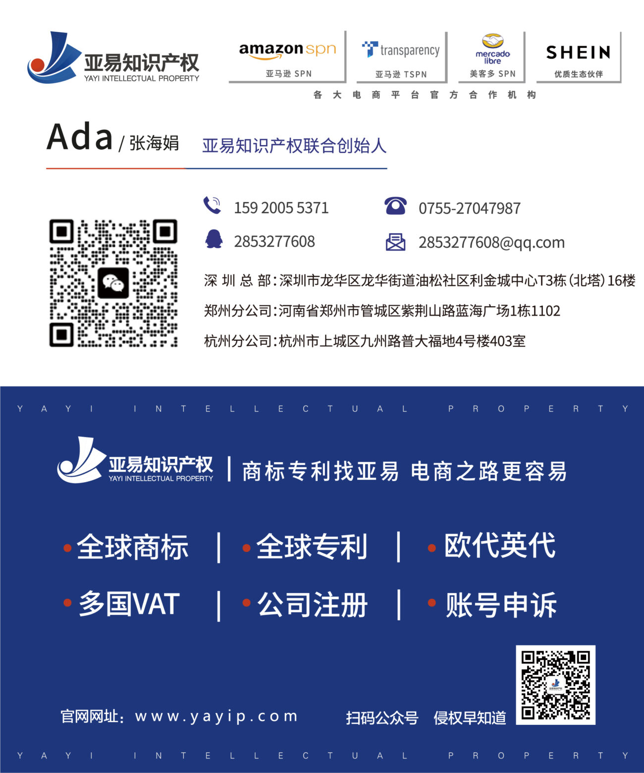 全球200个国家商标注册与转让-【亚易知识产权-联合创始人-Ada姐】知识产权/商标专利/VAT短视频/直播企业服务培训/咨询/法律 总经理 联合创始人姓名:张海娟(Ada姐) 手机:15920055371 公司:亚易知识产权 职务:联合创始人&总经理 QQ:2853277608 邮箱:2853277608@qq.com 地址: 深圳市龙华区龙华街道利金城中心T3栋(北塔)16楼 厦门市湖里区长虹路跨境电商产业园二期702单元 杭州市上城区九州路普大福地4号楼403网址:https://yayip.com 扫码在手机上查看